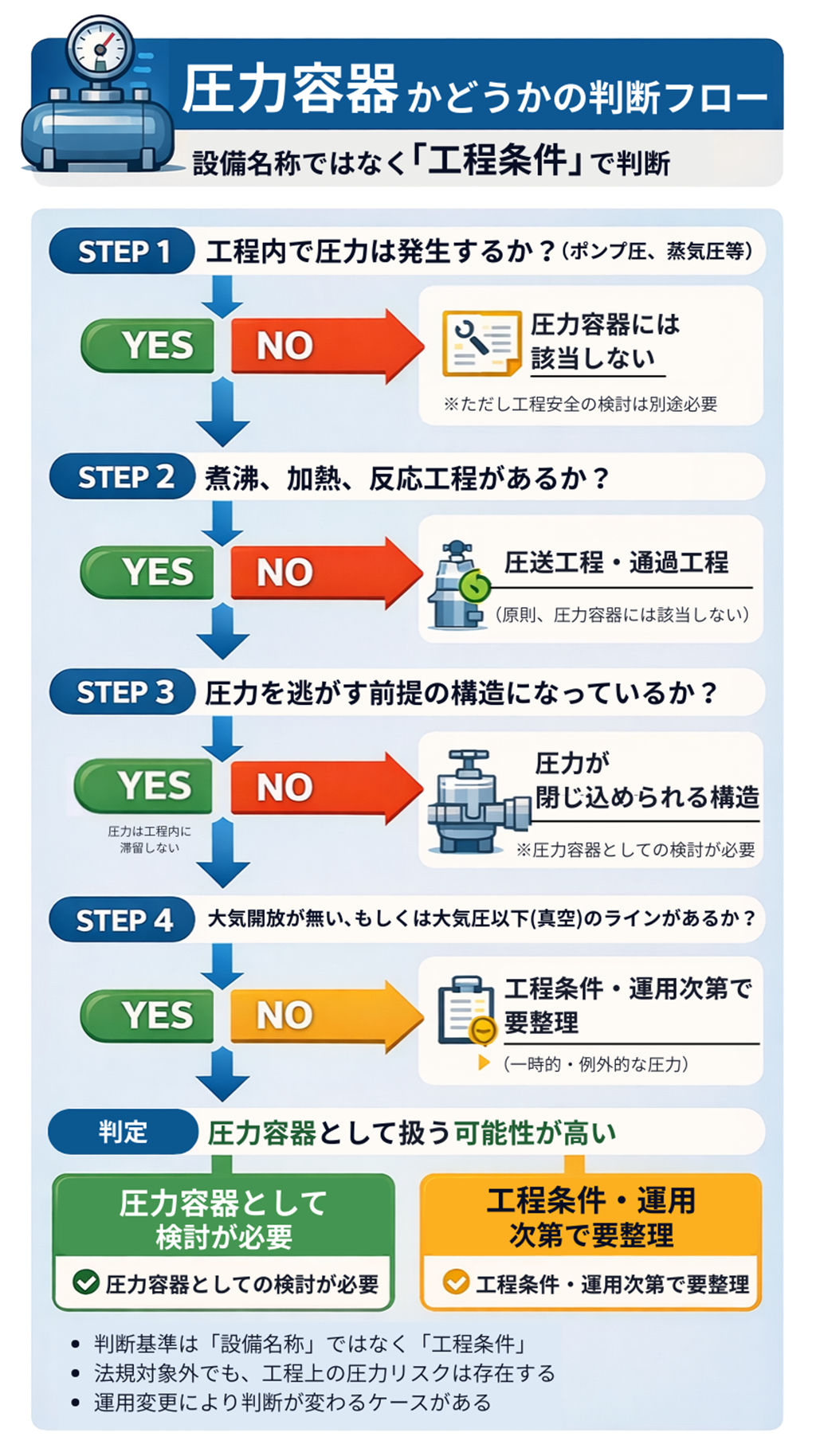 を整理した上で、圧力容器として考えるべきか/工程対策で足りるかを判断します。